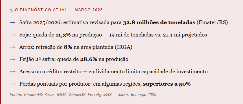 A safra 2025/2026 começou com estimativa de 35,3 milhões de toneladas — e foi revisada para 32,8 milhões, redução de 7,1%. A soja, principal cultura, projeta 19 milhões de toneladas — queda de 11,3% frente à estimativa inicial. O arroz recuou 8% na área plantada. Em algumas regiões, perdas superiores a 50%.
