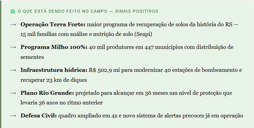 A tragédia expôs uma vulnerabilidade estrutural que vai além da falta de diques. Ela revelou o quanto o campo gaúcho ainda depende de práticas de manejo que aumentam os danos — abandono do terraceamento, simplificação do solo, falta de monitoramento hídrico em tempo real.