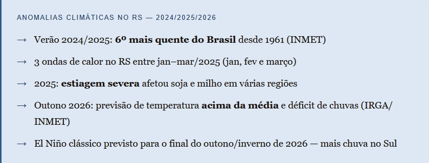 O que os dados mostram é uma oscilação extrema que não dá trégua ao produtor gaúcho: enchente histórica em 2024, calor e seca severa em 2025, e um 2026 que começa com déficit de chuvas e ameaça de novo El Niño. Não é um estado “fora do normal” — é uma nova normalidade climática que exige adaptação estrutural.